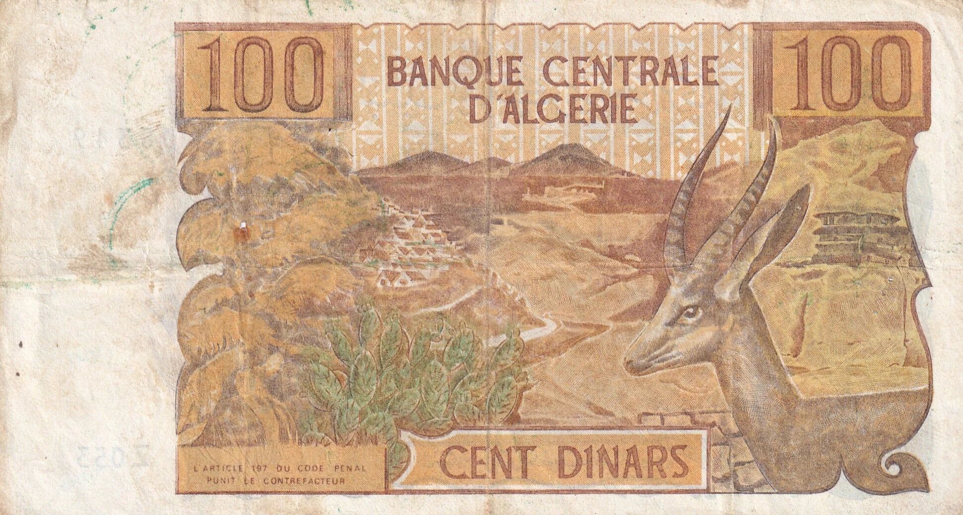 Le recto du billet présente un paysage montagneux qui contraste avec un paysage semi-aride. Cette scène est agrémentée de villages, d'un figuier de barbarie et d'une gazelle, éléments représentatifs de la géographie et de la faune algériennes. Les inscriptions en arabe comprennent la mention de la "Banque Centrale d'Algérie" (????? ??????? ????????) ainsi que la valeur nominale "Cent Dinars" (???? ?????) et le chiffre "100".