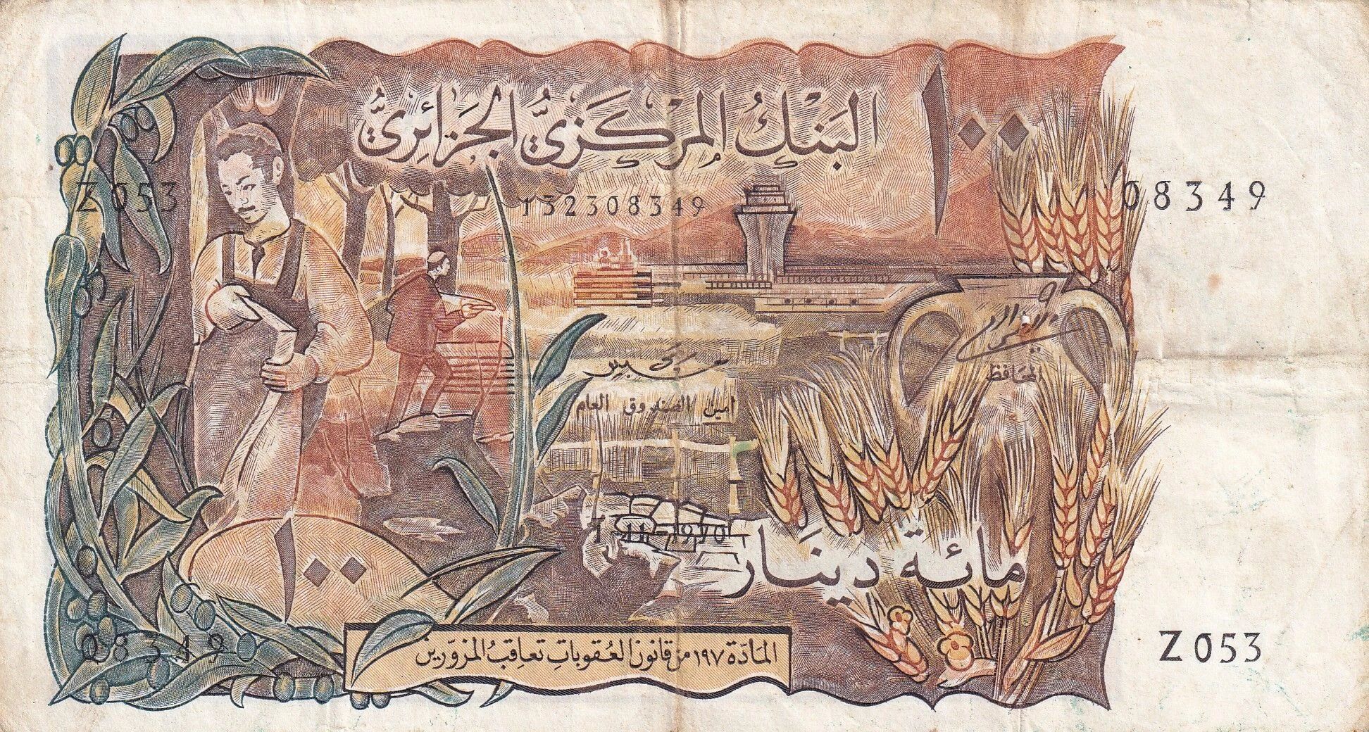 Le billet de 100 Dinars algériens, émis en 1970, se distingue par ses dimensions de 165 mm de longueur et 90 mm de largeur. Ce billet appartient à la série Z053.