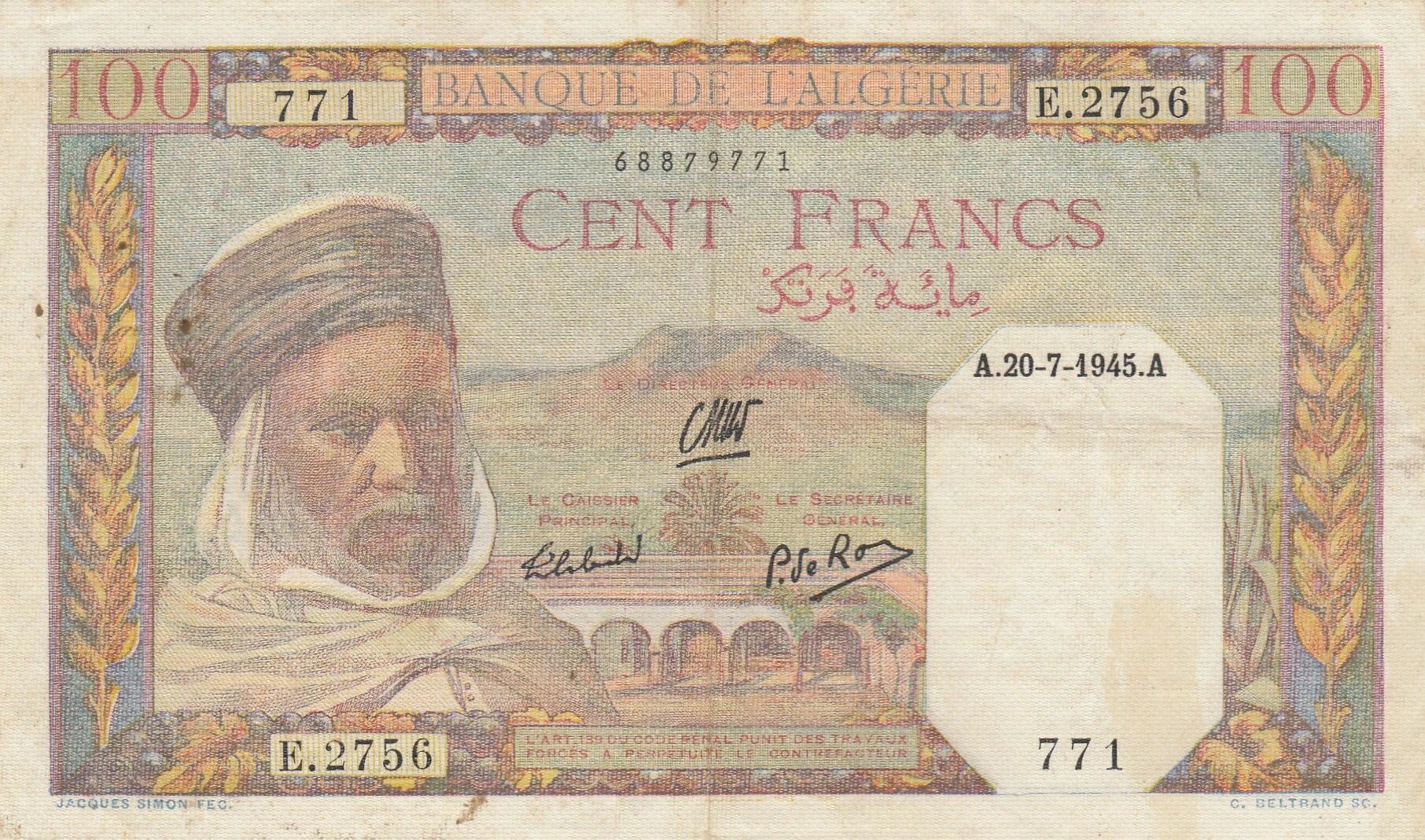 Le billet de 100 francs algériens, émis en 1945, présente un ensemble iconographique reflétant des aspects de la vie et de la culture algériennes de l'époque. Ce billet fait partie d'une série émise par l'Algérie.