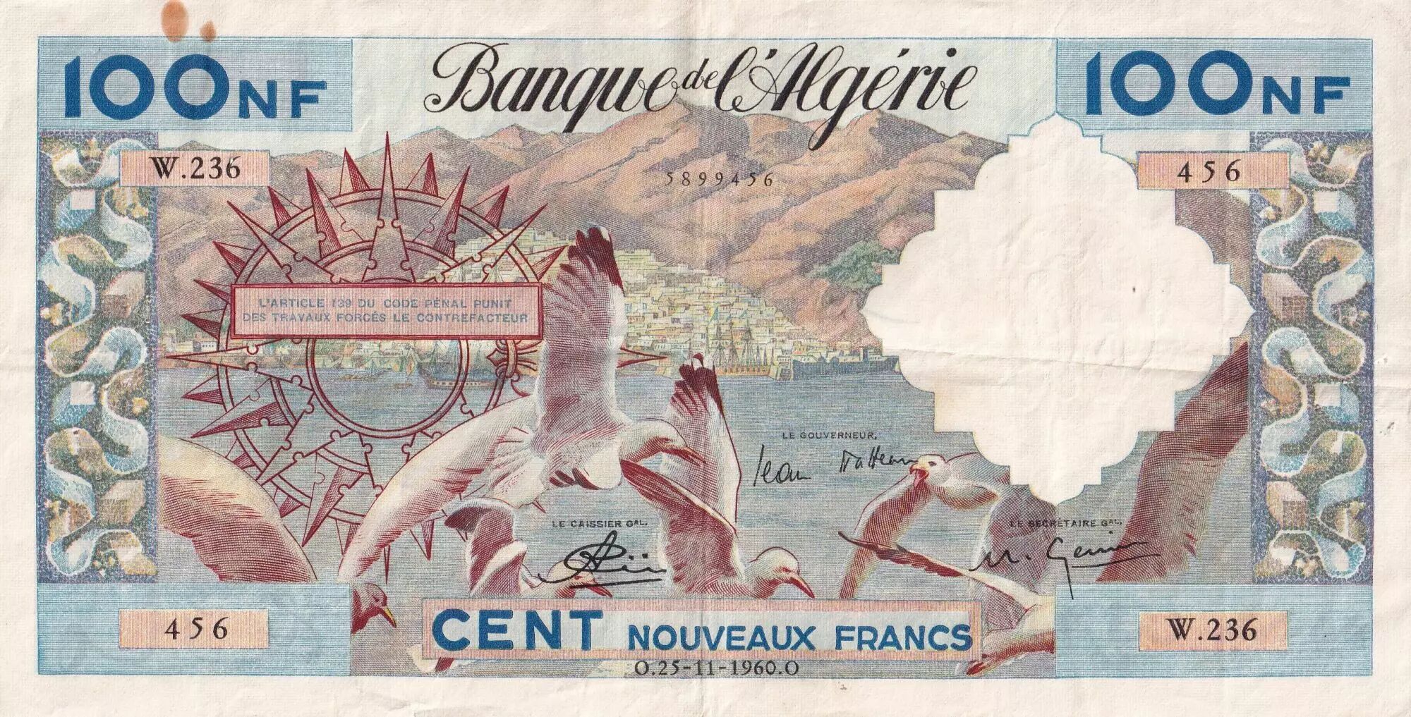 Accueil > Archivage > Algérie 100 NF - Mouettes - 25-11-1960 - Série W.236 - P.121b