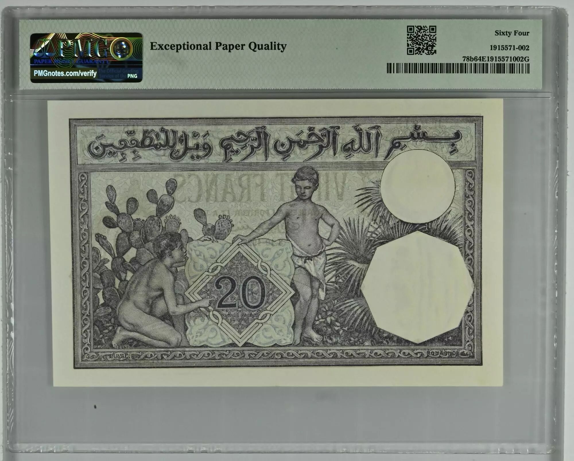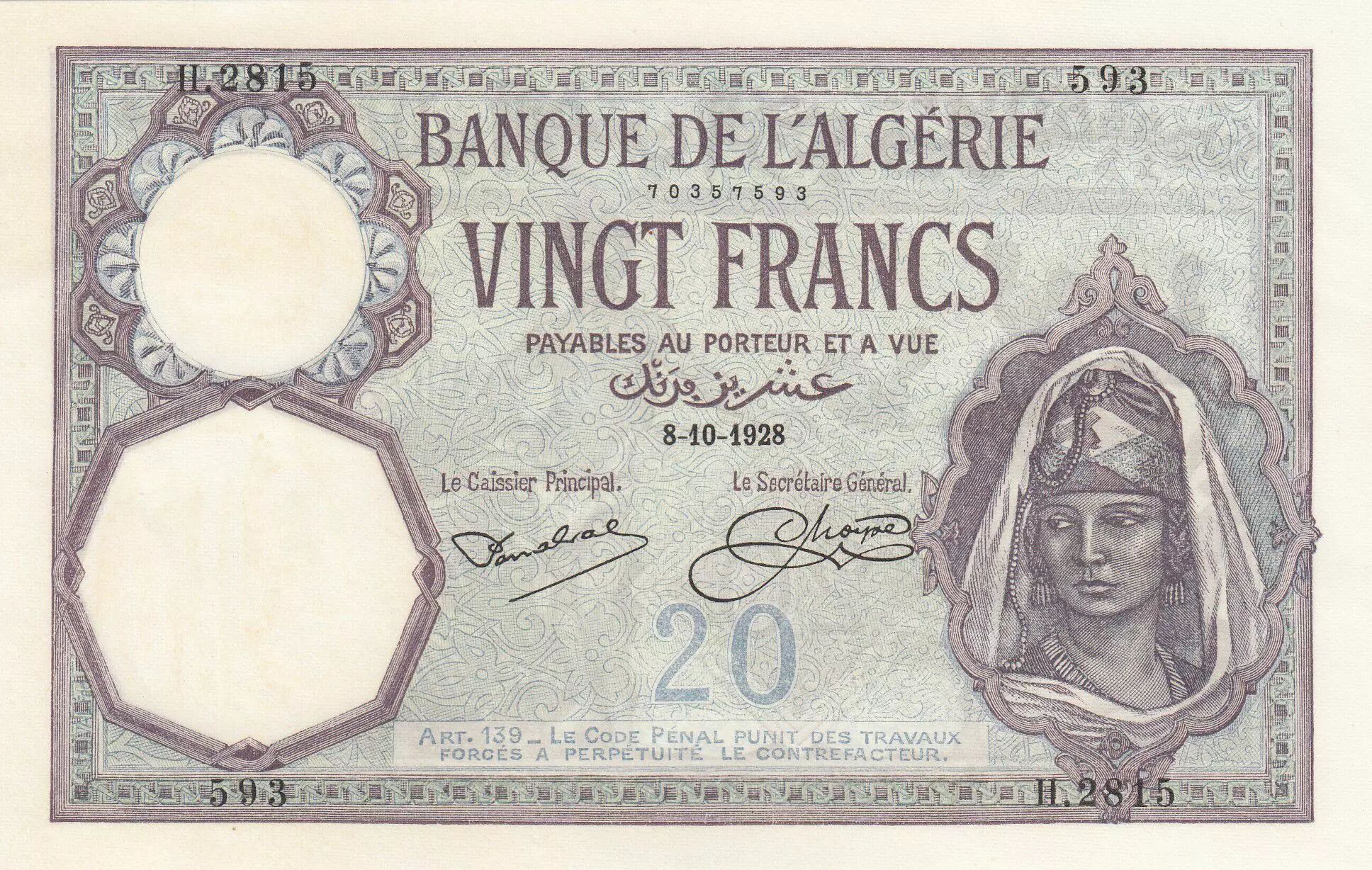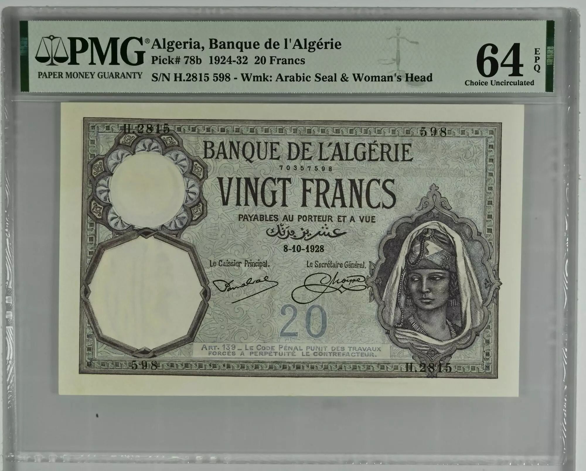 Accueil > Archivage > Algérie 20 Francs Jeune Femme - 1928 - P.78b - PMG 64 EPQ - Série H.2815
