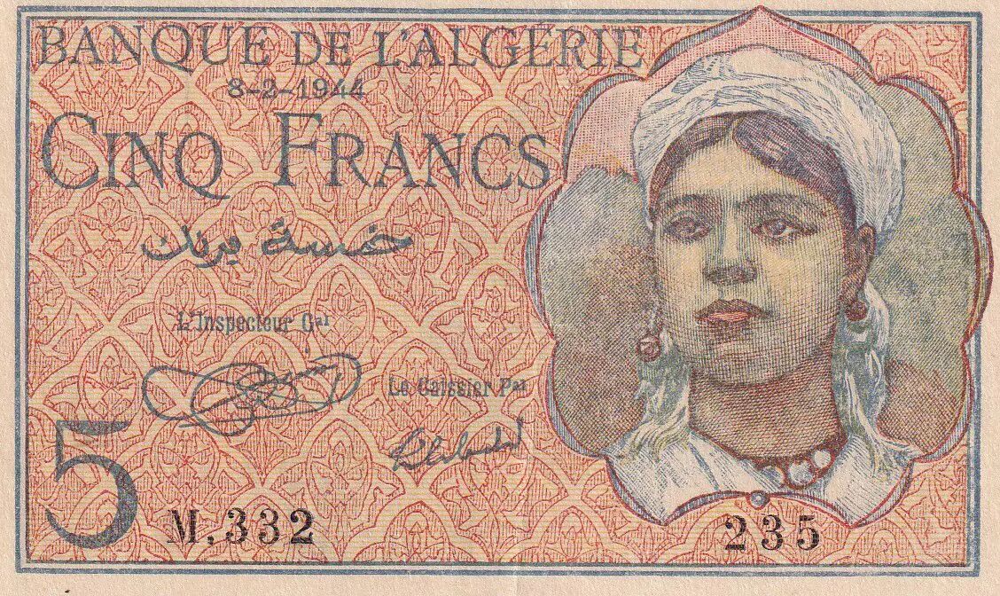 Billet Algérie 5 Francs - Jeune Femme - 08-02-1944 - Série M.332 - P.94a