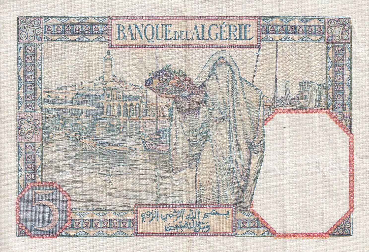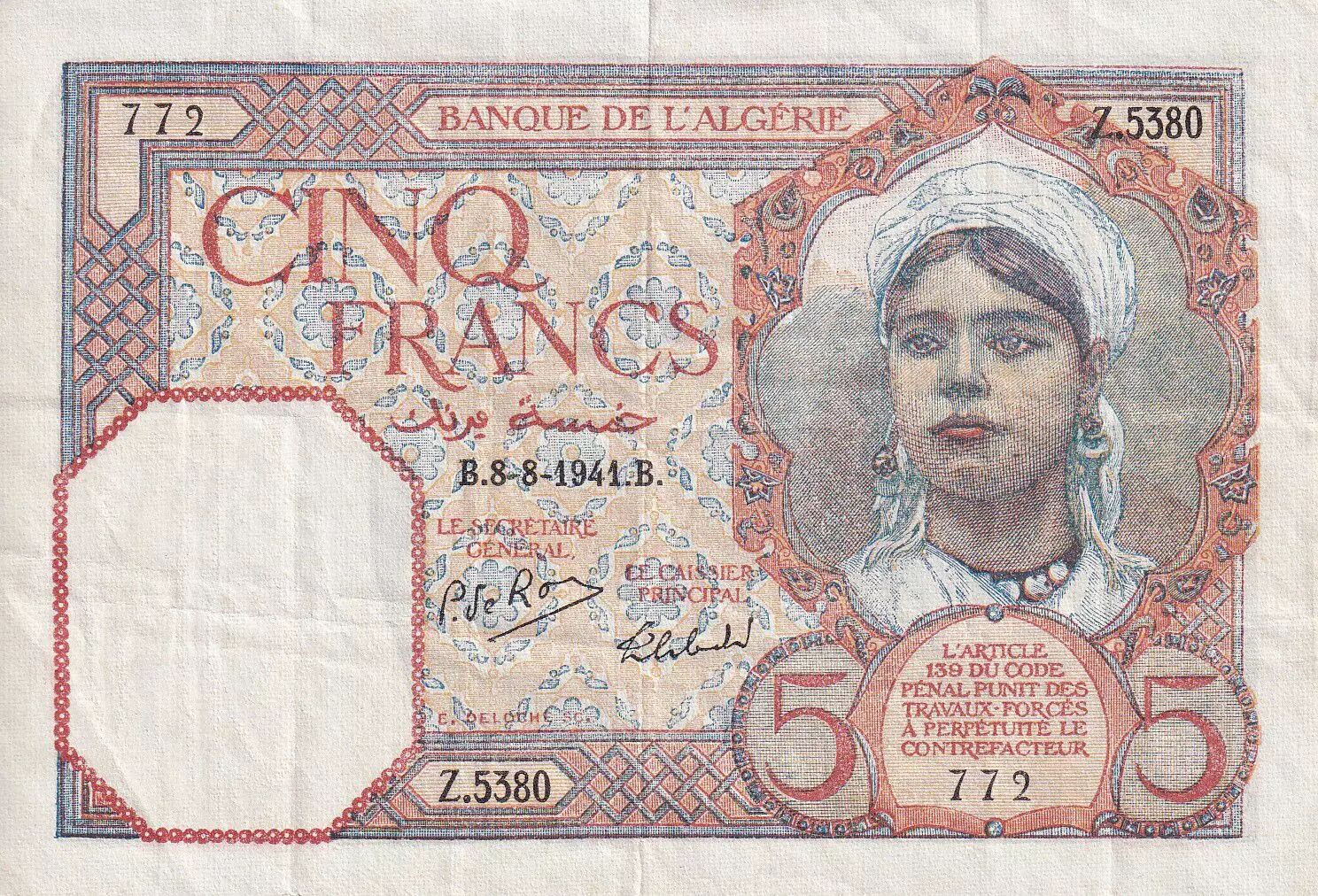 Billet Algérie 5 Francs - Jeune Femme - 08-08-1941 - Série Z.5380 - TTB+ - P.77b