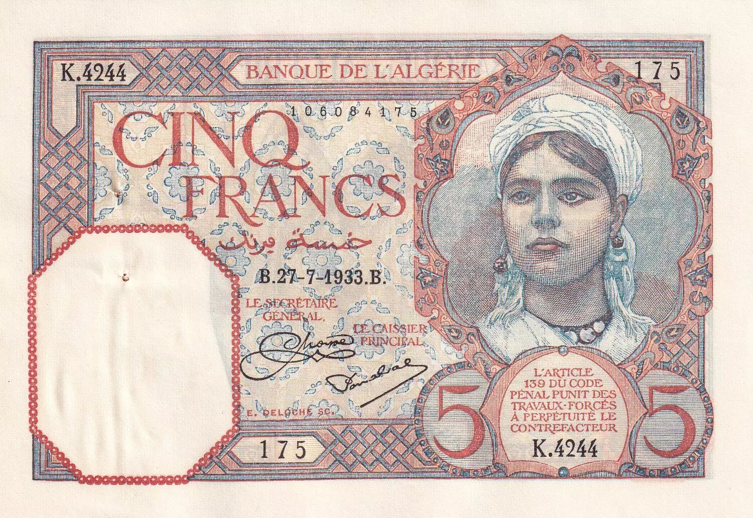 Accueil > Archivage > Algérie 5 Francs - Jeune Femme - 27-07-1933 - Série K.4244 - P.77a