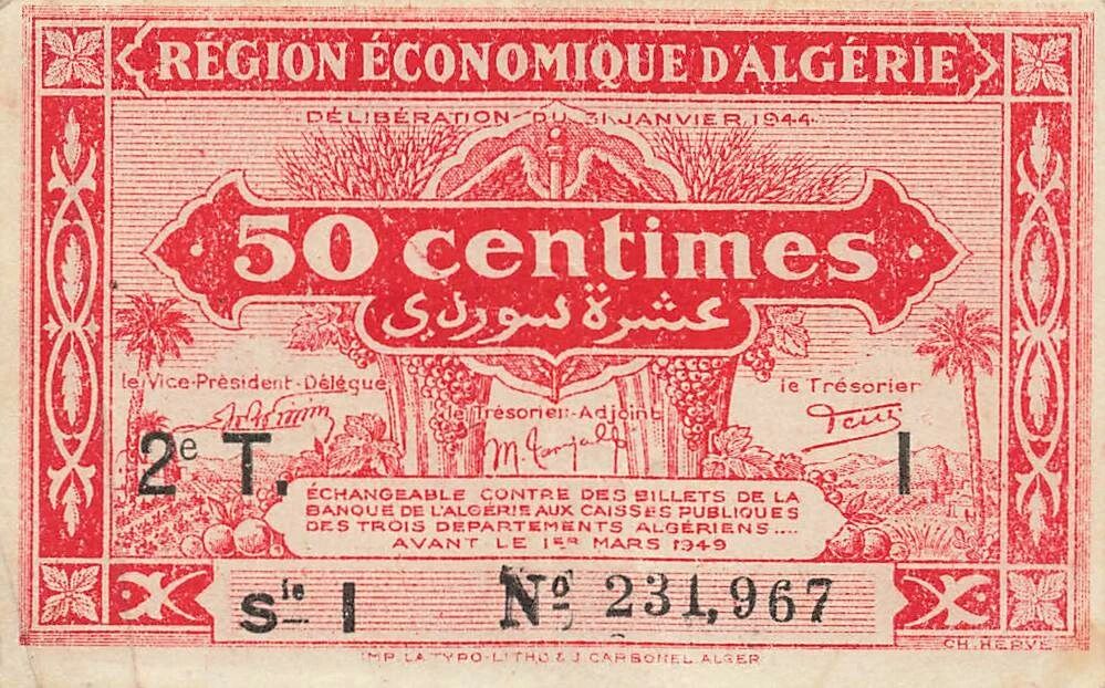 Billet Algérie 50 Centimes - 31-01-1944 - Série I - P.100