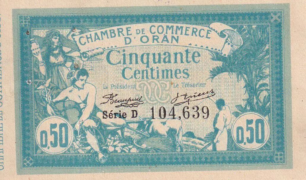 Accueil > Archivage > archivage-Billets du Monde > Algérie 50 Centimes - Chambre de commerce d'Oran - 1915 - Série D - P.141.1