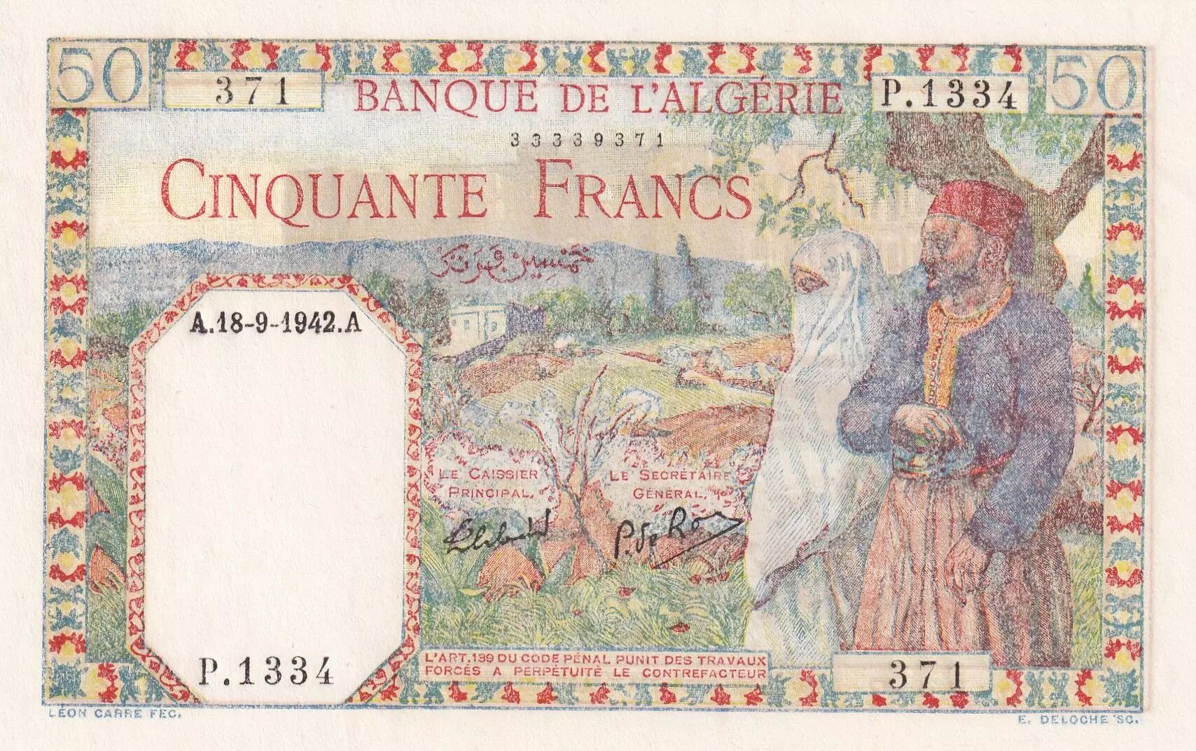 Accueil > Archivage > Algérie 50 Francs Couple - 18-09-1942 - Série P.1334 - Filigrane Lettre
