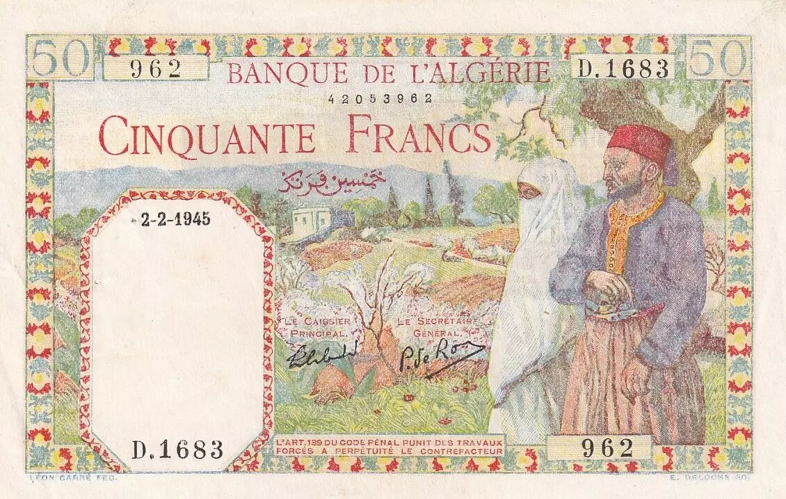 Ce billet de 50 francs, émis par la Banque de l'Algérie en date du 2 février 1945, se distingue par ses illustrations et filigranes spécifiques. Il mesure 145 mm de longueur et 92 mm de largeur.