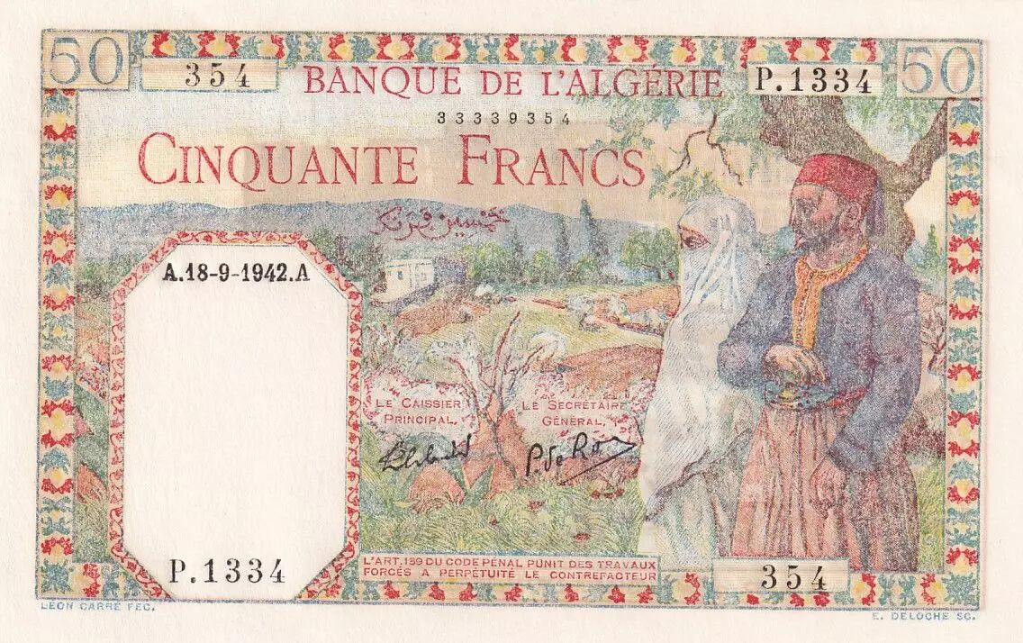 Billet Algérie 50 Francs - Couple - Filigrane lettre - 18-09-1942 - Série P.1334