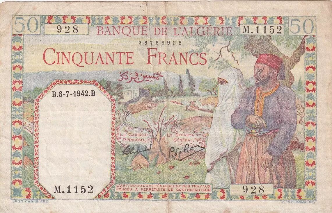 Billet Algérie 50 Francs - Couple - Filigrane Tête de femme - 06-07-1942 - Série M.1152