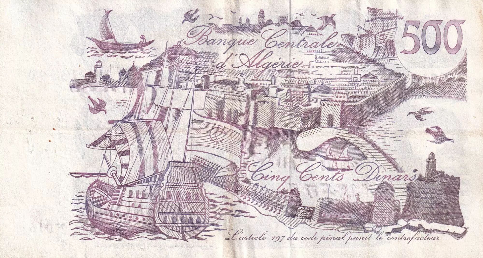 Accueil > Archivage > Algérie 500 Dinars - Vue de la ville - Galion et forteresse - 1970 - Série F.016 - P.129