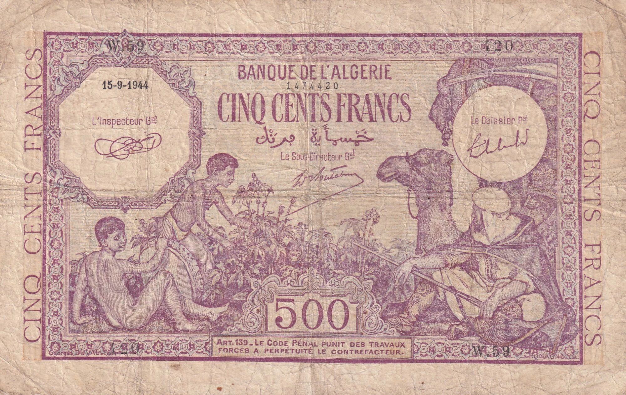 Ce billet de banque d'Algérie a été émis le 15 septembre 1944. Il représente une valeur nominale de 500 francs.