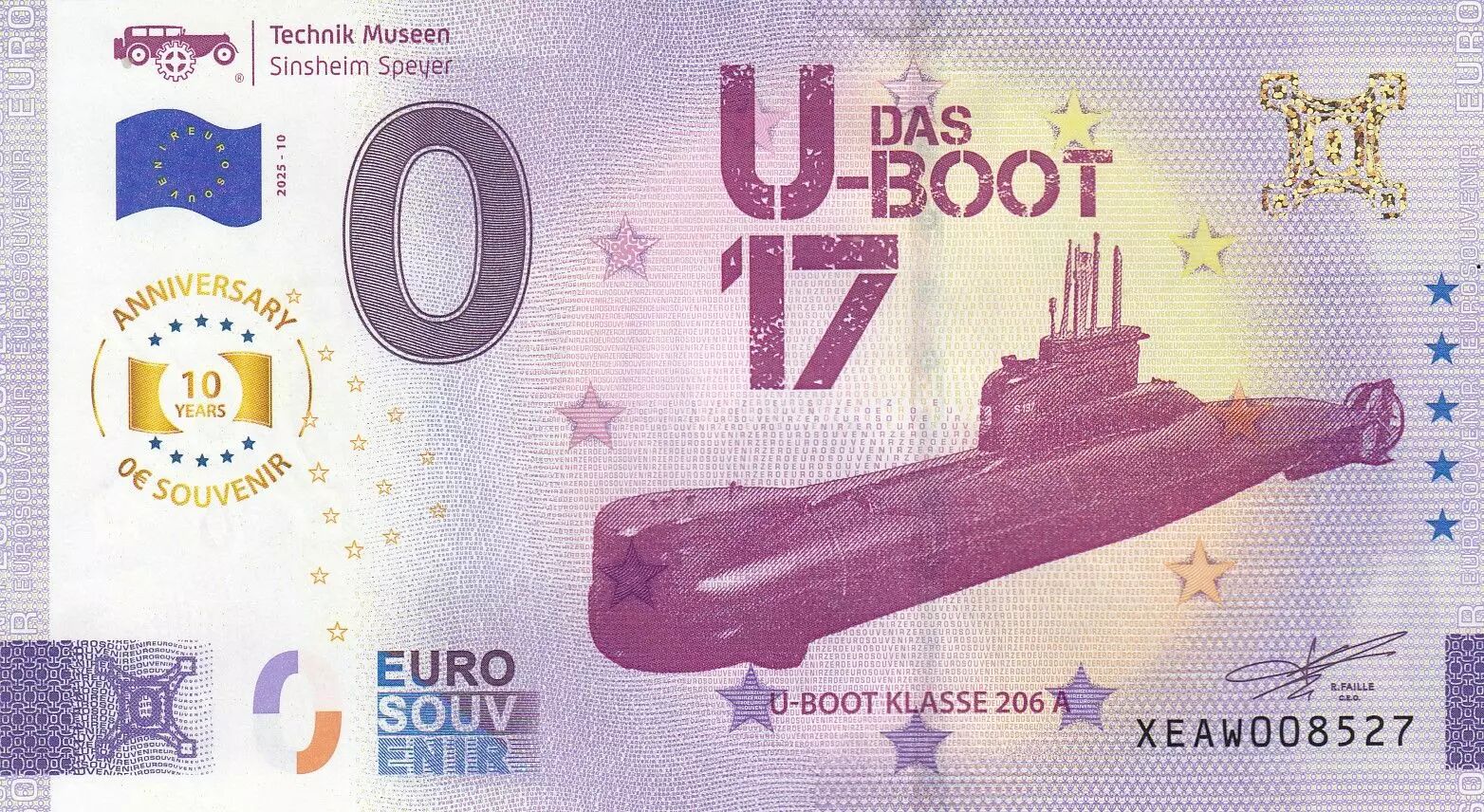 Le billet met en scène le sous-marin U DAS BOOT 17, un submersible allemand dont l'histoire est mise en avant à travers cet hommage numismatique. L'année d'émission, 2025, coïncide avec un anniversaire significatif lié à ce sous-marin, soulignant l'importance historique de cet engin naval.