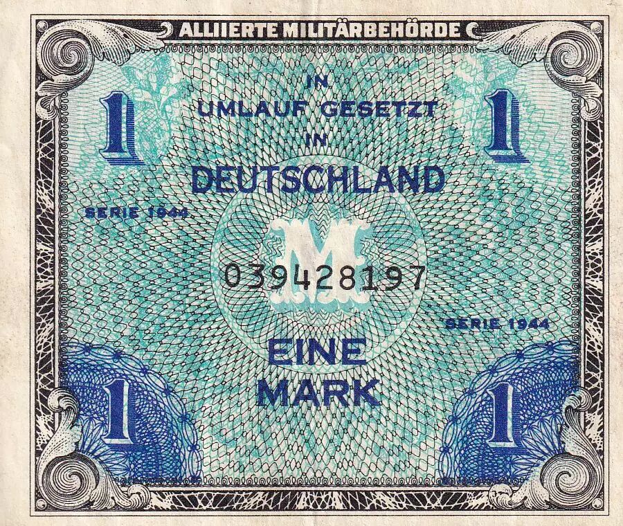 Accueil > Archivage > Allemagne 1 Mark Impr. américaine - 1944 9 digit avec F - TTB - P.192a
