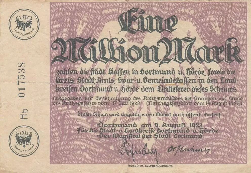 Billet Allemagne 1 Millionen Mark - Etat de Dortmund - 09-08-1923 - Numéro 017538