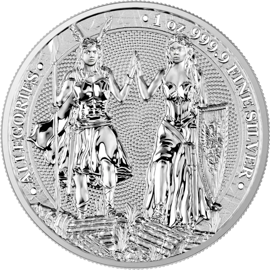 Galia et Germania est la sixième et dernière pièce de la série Allégories qui est présentée aux collectionneurs en 2023. Cette série représente des personnifications de pays du monde entier sous la forme de femmes belles voluptueuses et fortes. La pièce de cette année qui symbolise la victoire sur les forces d'occupation se veut porteuse d'espoir et de réconfort.