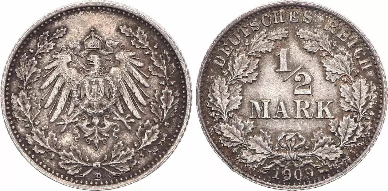 Pièce Allemagne 1/2 Mark 1909 D - Aigle couronné, argent