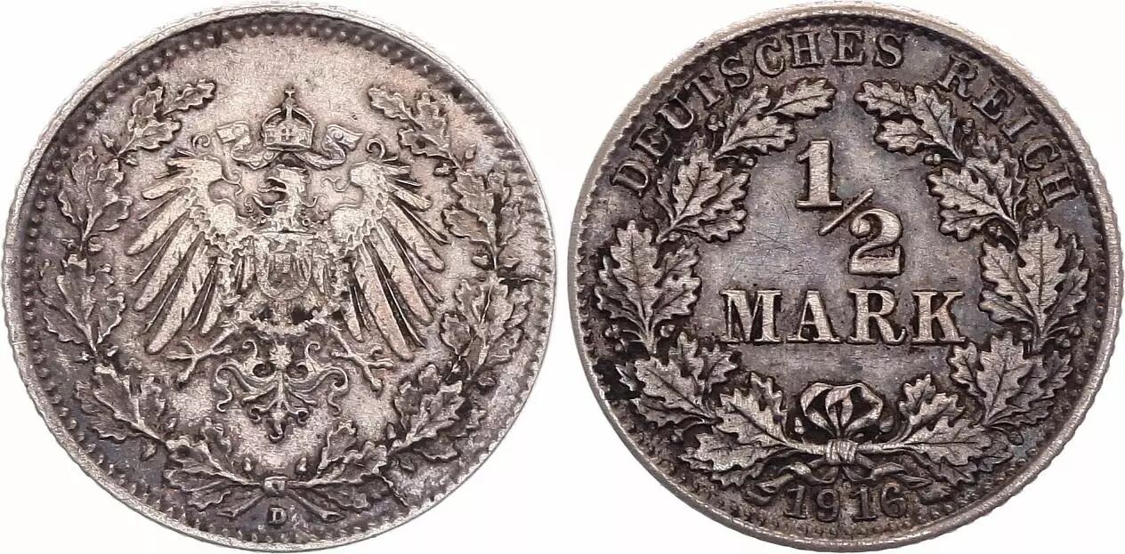Accueil > Archivage > archivage-Monnaies du monde > Allemagne 1/2 Mark 1916 D - Aigle couronné, argent