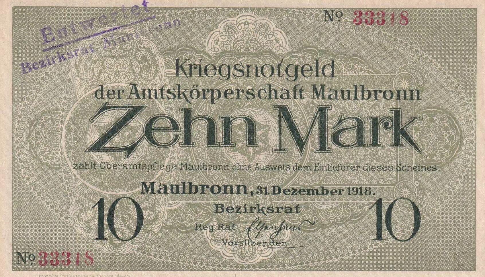 Billet Allemagne 10 Mark - Maulbronn - Notgeld - 31-12-1918 - SPL