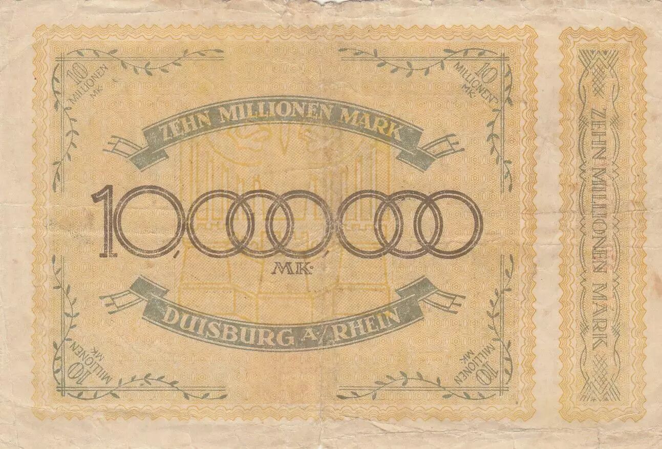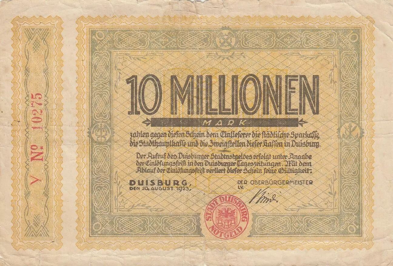 Billet Allemagne 10 millions de Mark - Ville de Duisburg - Numéro 10275 - 1923