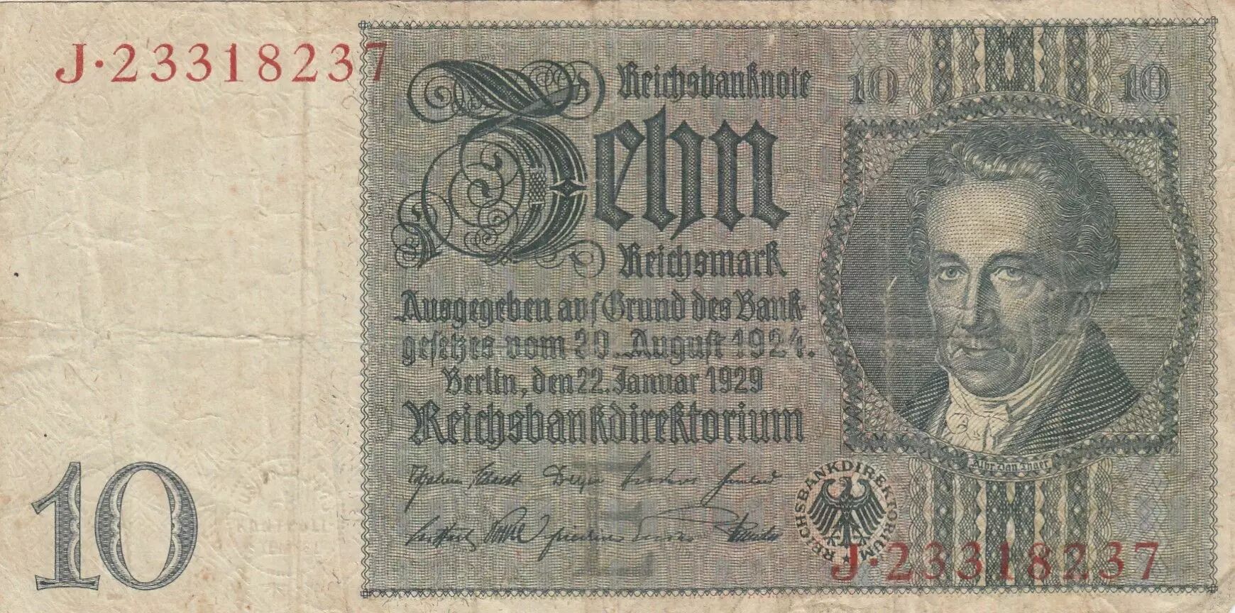 Billet Allemagne 10 Reichsmark - Albrecht D. Thaer - Série J - 1929 - P.180a