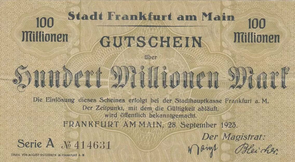 Billet Allemagne 100 000 000 Mark - Ville de Main-Frankfurt - Série A - 1923