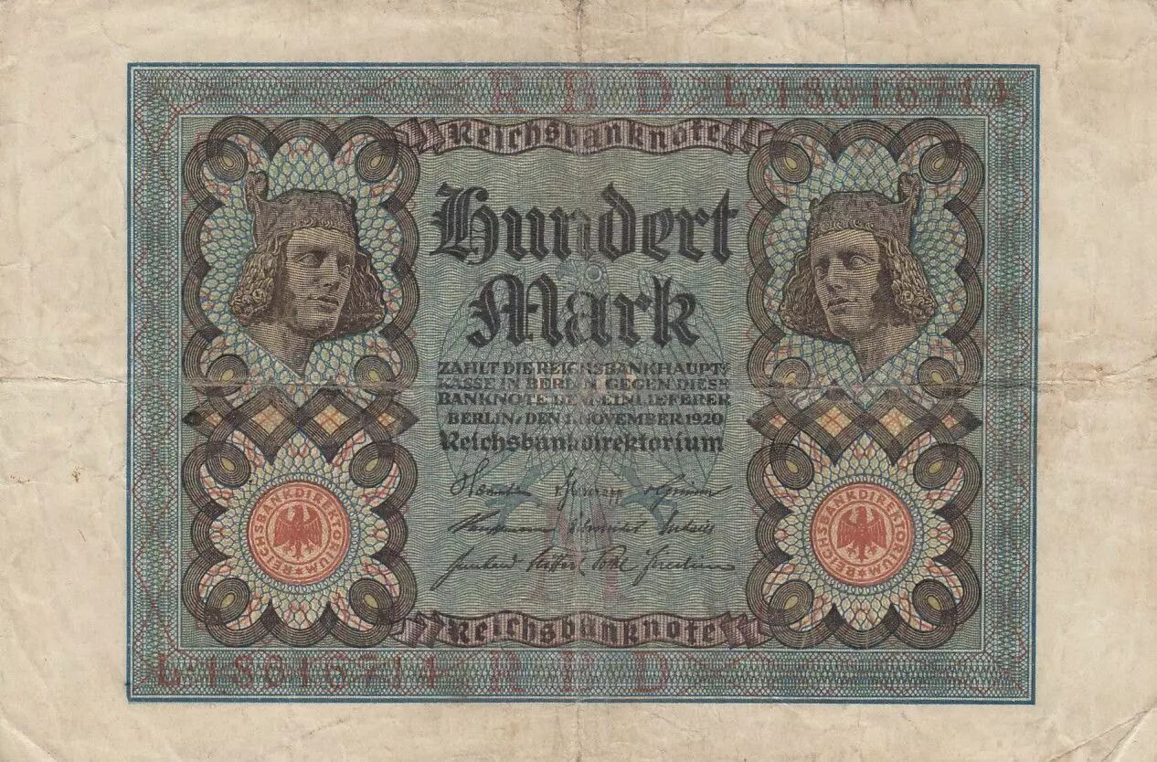Accueil > Billets du Monde > Billets d'Europe > Allemagne - Etats Allemands > Allemagne > Allemagne 100 Mark - Cavalier de Bamberg - 8 digit - 1920 - Série L - P.69b