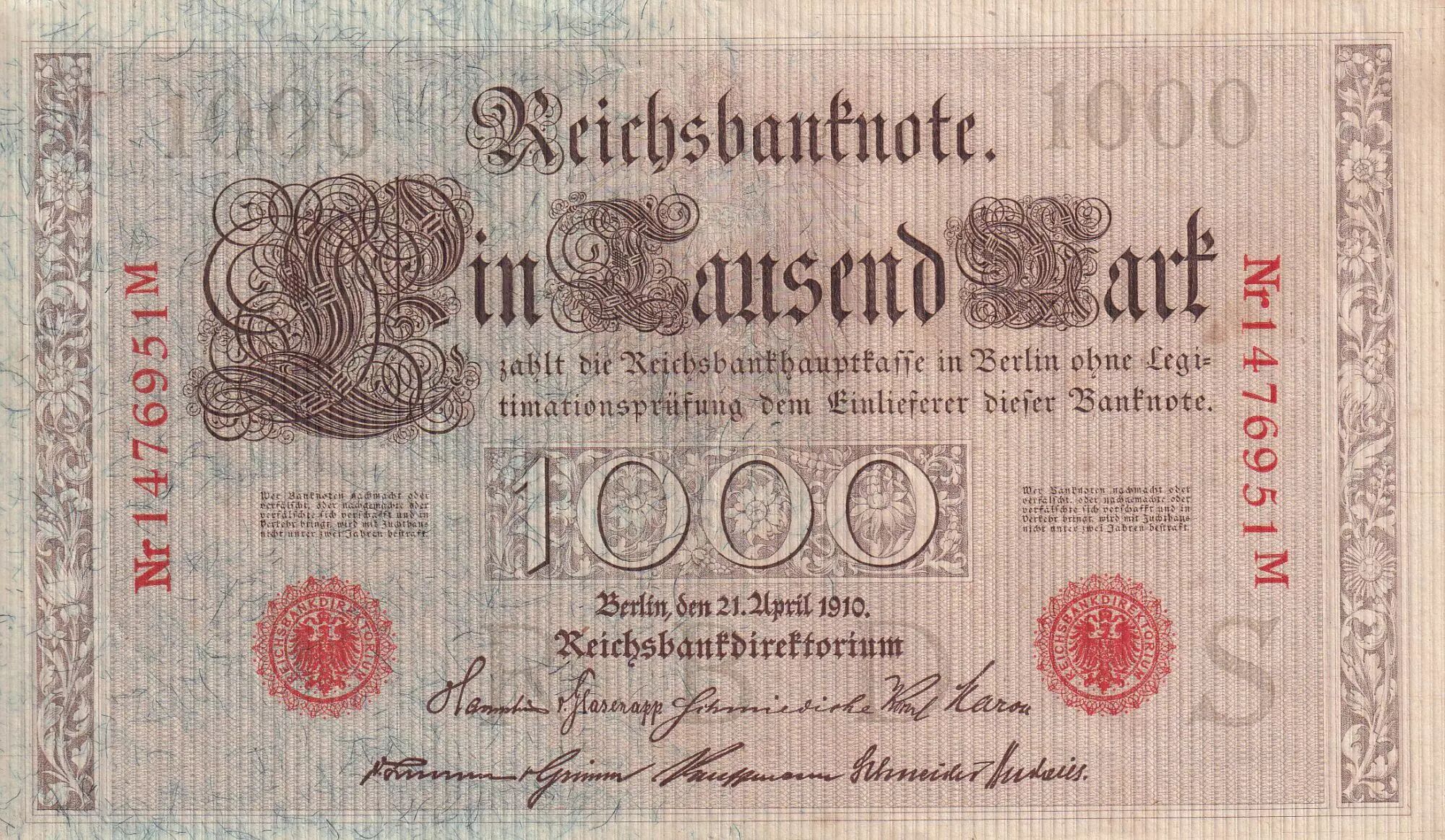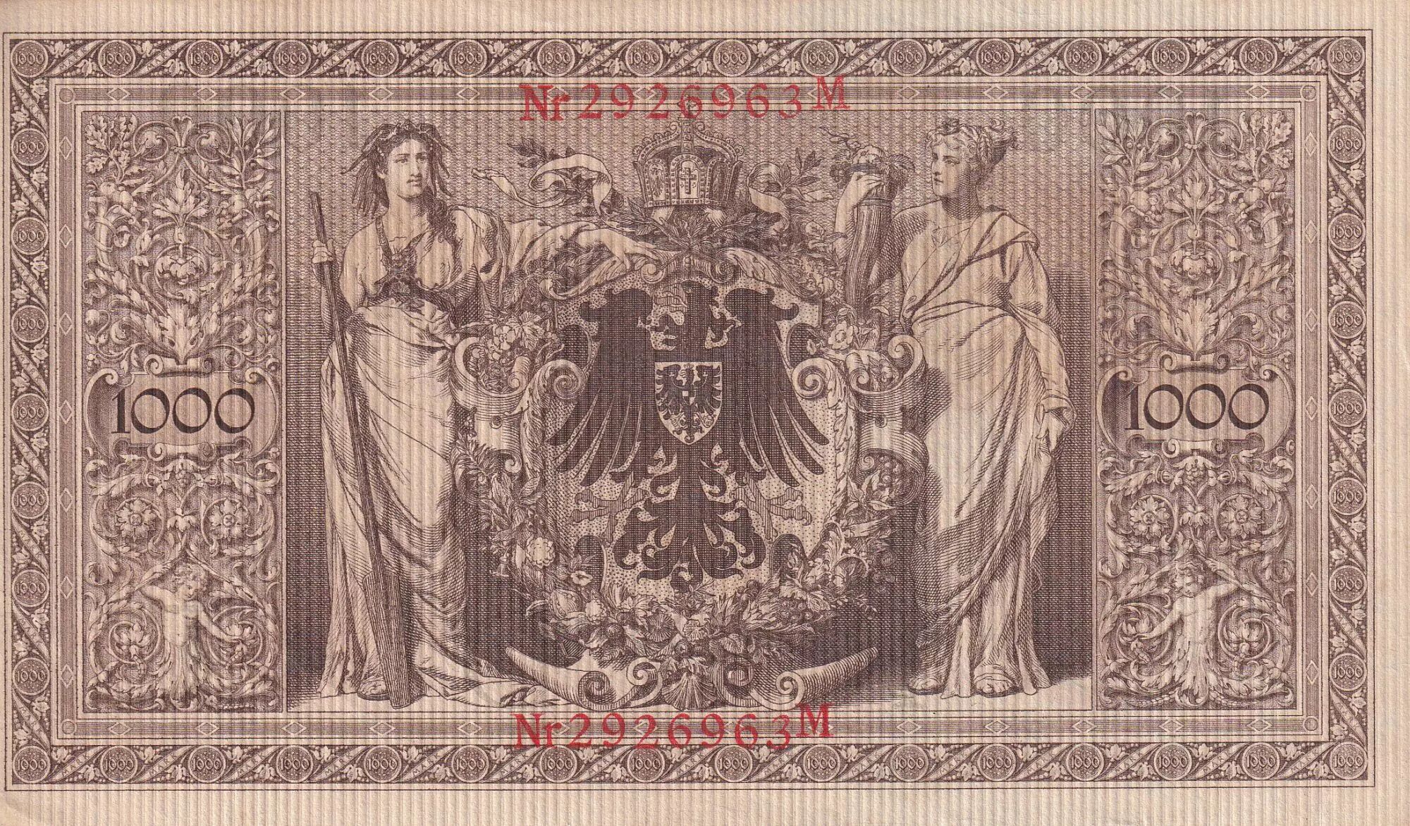 Accueil > Archivage > archivage-Billets du Monde > Allemagne 1000 Mark - Brun numérotation rouge - 1910 - 7 chiffres - Série M - P.44