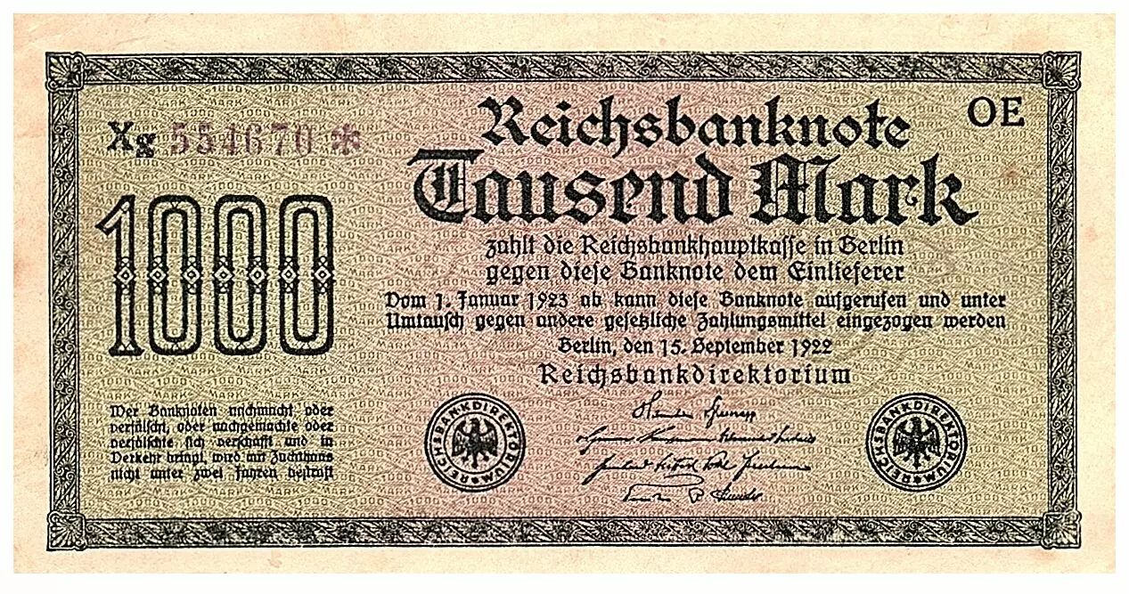 Accueil > Billets du Monde > Billets d'Europe > Allemagne - Etats Allemands > Allemagne > Allemagne 1000 Mark Vert, lilas - 1922 - série Xg-OE