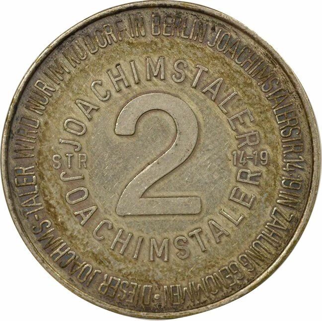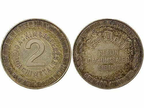 Revers : 2 / JOACHIMSTALER / JOACHIMSTALER / STR - 14-19 / . DIESER JOACHIMS TALER WIRD NUR IM KUDORF IN BERLIN JOACHIMSTALER STR 14 19 IN ZAHLUNG GENOMMEN