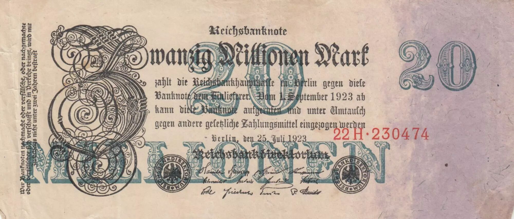 Accueil > Archivage > archivage-Billets du Monde > Allemagne 20 Millionen mark - Reichsbanknote - Série 22H - 1923