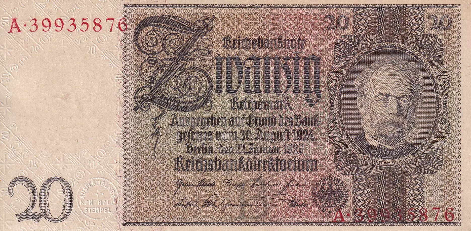 Billet Allemagne 20 Reichsmark - Werner Von Siemens - 1929 - Série A - P.181a