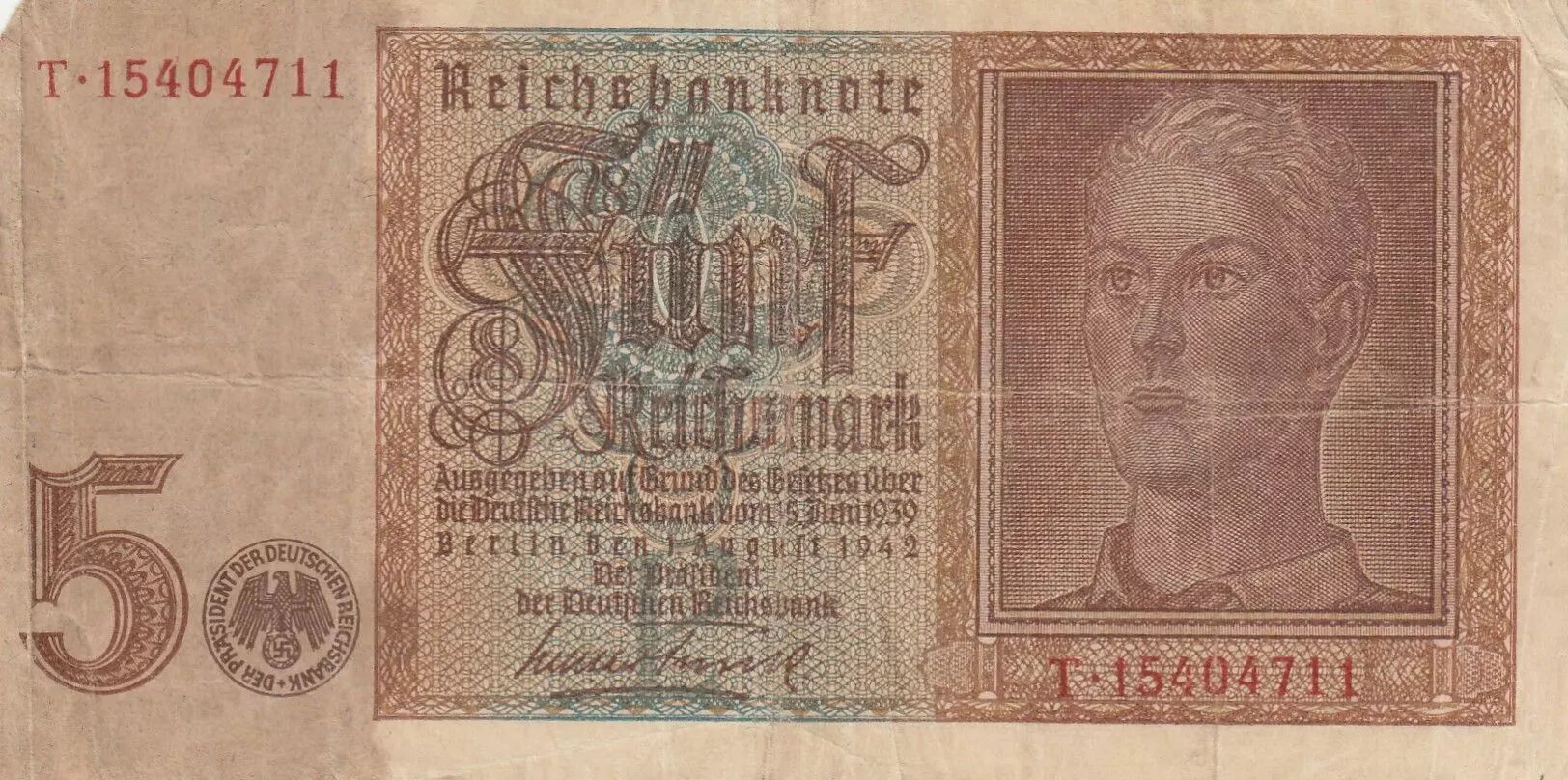 Billet Allemagne 5 Mark - Monument au lion Saxon - Série T - 1942 - P.186a