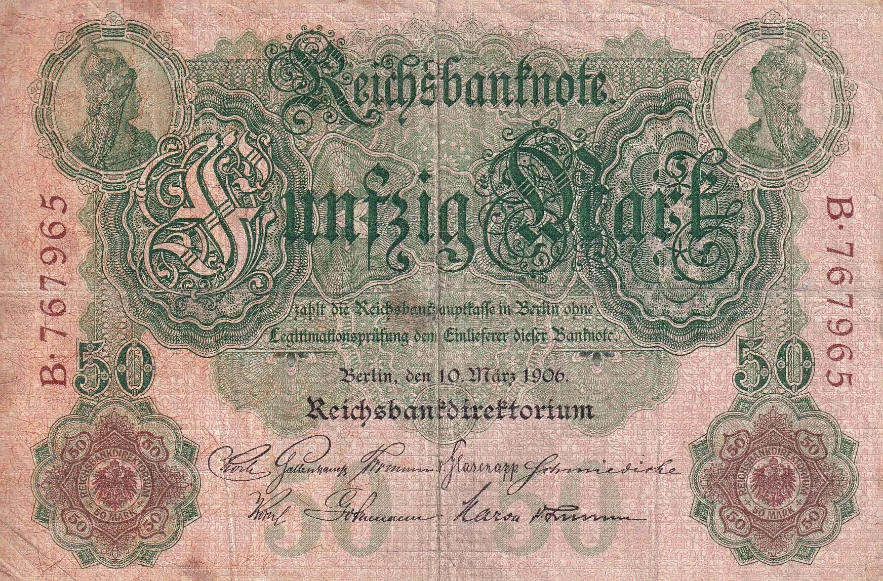 Accueil > Archivage > Allemagne 50 Mark - Vert & Rose - 1906 - Série B - 6 digit - P.26a
