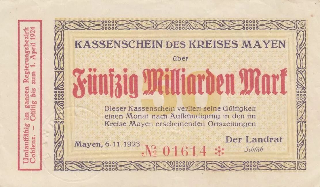 Billet Allemagne 50 milliards mark - Etat de Mayenne - Numéro 01614 - 1923