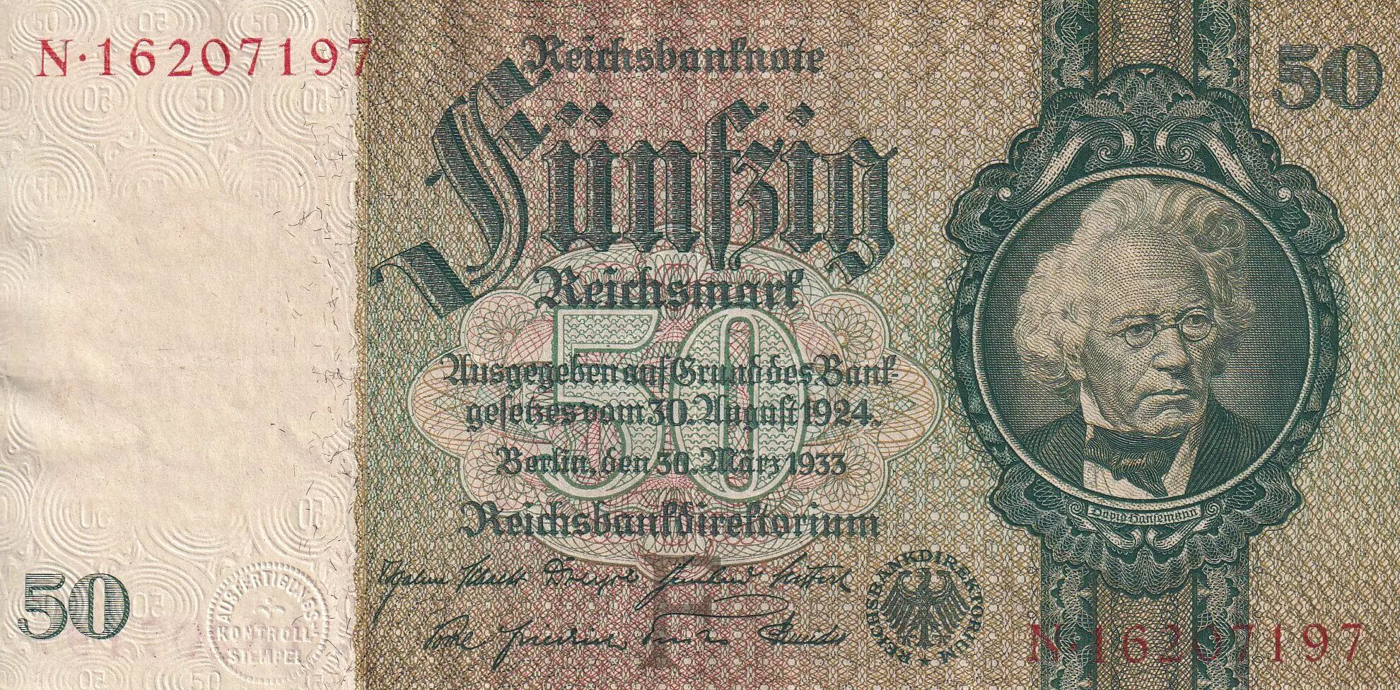 Accueil > Archivage > Allemagne 50 Reichsmark - David Hansemann - 1933 - Série N - P.182a