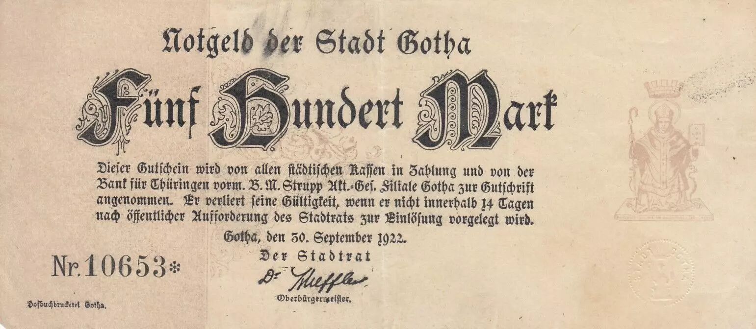 Billet Allemagne 500 mark - Etat de Gotha - Numéro 10653 - 1922