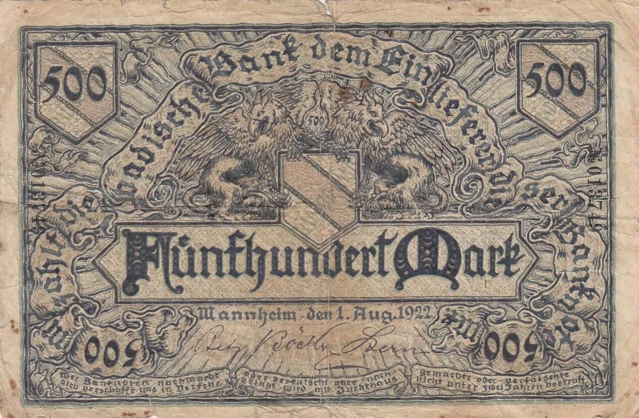 Billet Allemagne 500 mark - Etat de Mannheim - Numéro 013149 - 1922