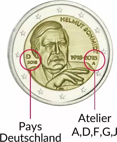 Le Chancelier allemand Helmut Schmidt est décédé en 2015 sont pays lui rend hommage avec cette 2 euros commémoratives 2018 qui célébre le centenaire de sa naissance. Il est représenté dans une posture caractéristique. Figurent l?inscription «HELMUT SCHMIDT» et à droite les dates «1918-2015». La marque d?atelier de la Monnaie concernée figure sous ces dates. Du côté gauche se trouvent le code du pays émetteur «D» et en dessous l?année d?émission «2018». En bas figurent les initiales de l?artiste.