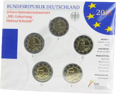BLISTER BU 5 x 2 Euros Commémorative ALLEMAGNE Helmut Schmidt 2018 - les 5 ateliers : A D F G J.