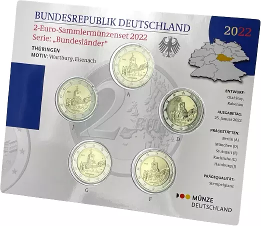 Accueil > Archivage > archivage-Archivage > Allemagne BLISTER BU 5 X 2 Euros Commémo. Allemagne 2022 - Thuringe - Château de la Wartbourg (5 Ateliers)