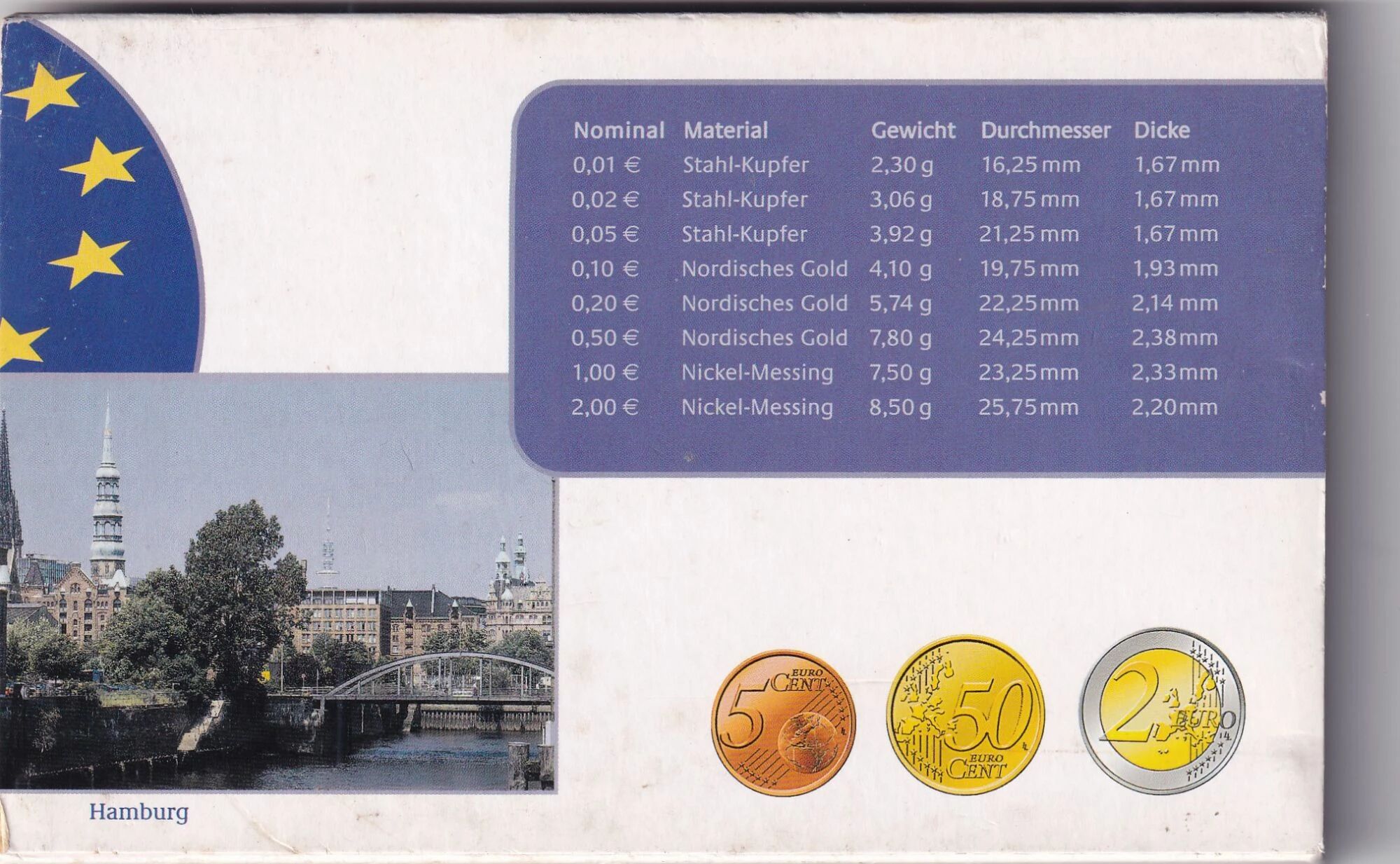L'atelier de frappe est identifié par la lettre "J", indiquant que les pièces ont été produites à Hambourg. Chaque pièce est conçue selon les spécifications techniques standardisées de la zone euro. Les pièces de 1, 2 et 5 centimes sont composées d'acier recouvert de cuivre, affichant une couleur rougeâtre caractéristique. Les pièces de 10, 20 et 50 centimes sont fabriquées en "or nordique", un alliage de cuivre, d'aluminium, de zinc et d'étain, leur conférant une teinte dorée. Les pièces de 1 et 2 euros sont bimétalliques ; la pièce de 1 euro combine une partie centrale en cupro-nickel et une couronne en laiton-nickel, tandis que la pièce de 2 euros inverse cette composition, avec une partie centrale en laiton-nickel et une couronne en cupro-nickel.