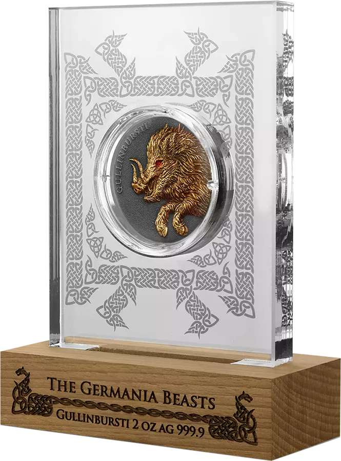 Selon la mythologie germanique, Gullinbursti a été forgé par les nains Sindri et Brokkr comme cadeau pour le dieu Freyr. Ses poils d'or ne se contentaient pas d'éclairer les ténèbres, ils le rendaient aussi incroyablement rapide et indestructible. Sur cette pièce unique, Germania Mint lui a donné une apparence encore plus majestueuse : ses défenses sont ornées de runes anciennes, ce qui lui confère un pouvoir magique et une signification mystique.