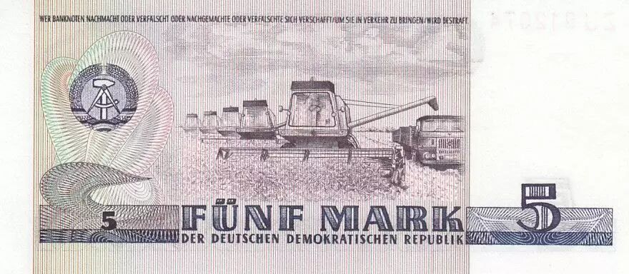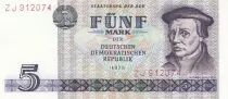 Billet Allemagne (RDA) 5 Mark - Thomas Muntzer - Moissonneuses batteuses - 1975 - Série ZJ - P.27
