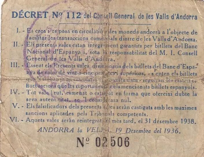 Home > > Andorra 1 Pesseta - 1936 - First Type Blue - 02506