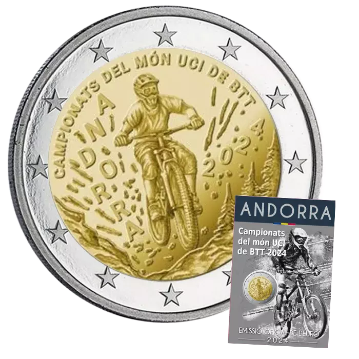 The 2 euro commemorative coin issued by Andorra in 2024 is dedicated to the UCI Mountain Bike World Championships. This bi-metallic coin features a nickel brass center and a cupro-nickel ring, with a weight of 8.5 grams and a diameter of 25.75 millimeters, for a thickness of 2.20 millimeters.
