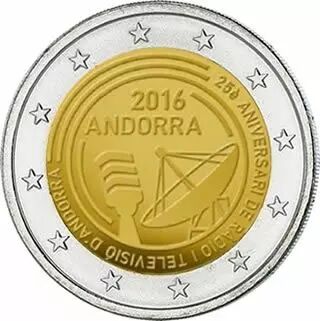 The motif is a microphone and antenna surrounded by several circular lines. The text is "25E Aniversari de Ràdio i Televisió d'Andorra", the year of issue "2016" and the country of issue "ANDORRA". This 2 euro coin commemorates the 25th anniversary of Andorran radio and television. The outer ring represents the twelve stars of the European flag.