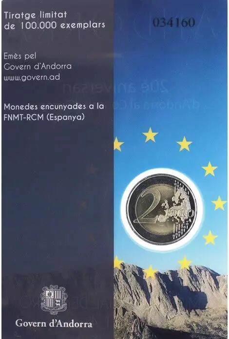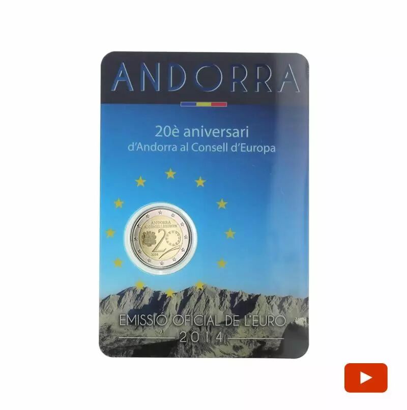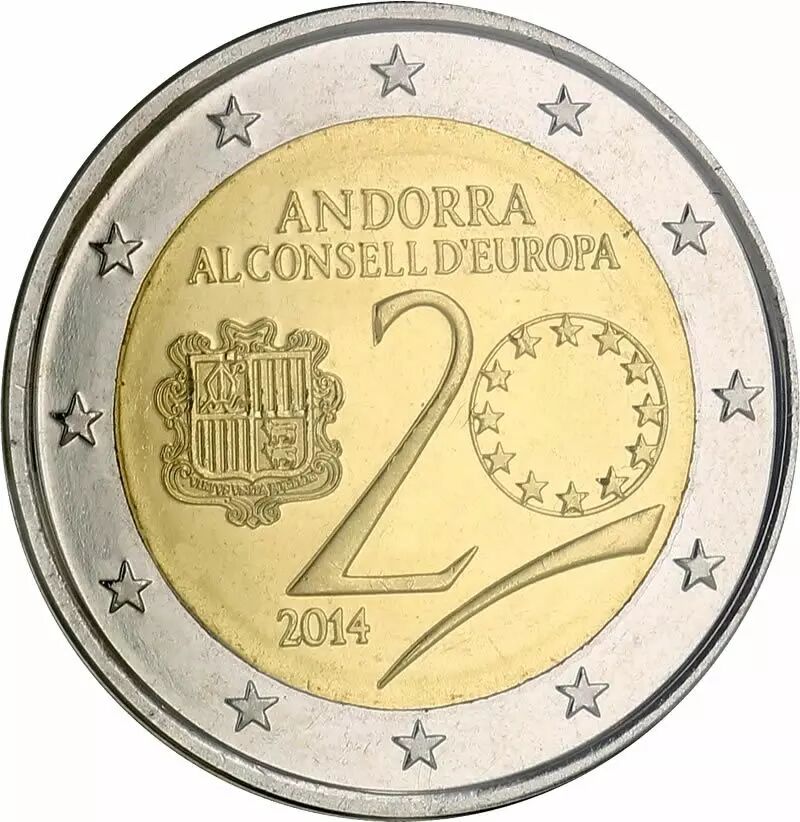Cette pièce commémorative de 2 euros a été émise par Andorre en 2014. Elle célèbre le 20e anniversaire de l'entrée de la Principauté d'Andorre au Conseil de l'Europe. La pièce est frappée en qualité BU (Brillant Universel).