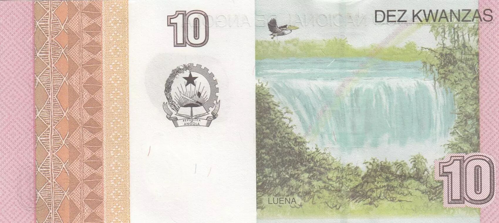 Le verso du billet illustre la cascade de Luena, un site naturel emblématique de l'Angola. La valeur nominale "DEZ KWANZAS" est inscrite en haut du billet. Les armoiries nationales sont positionnées sur la gauche.