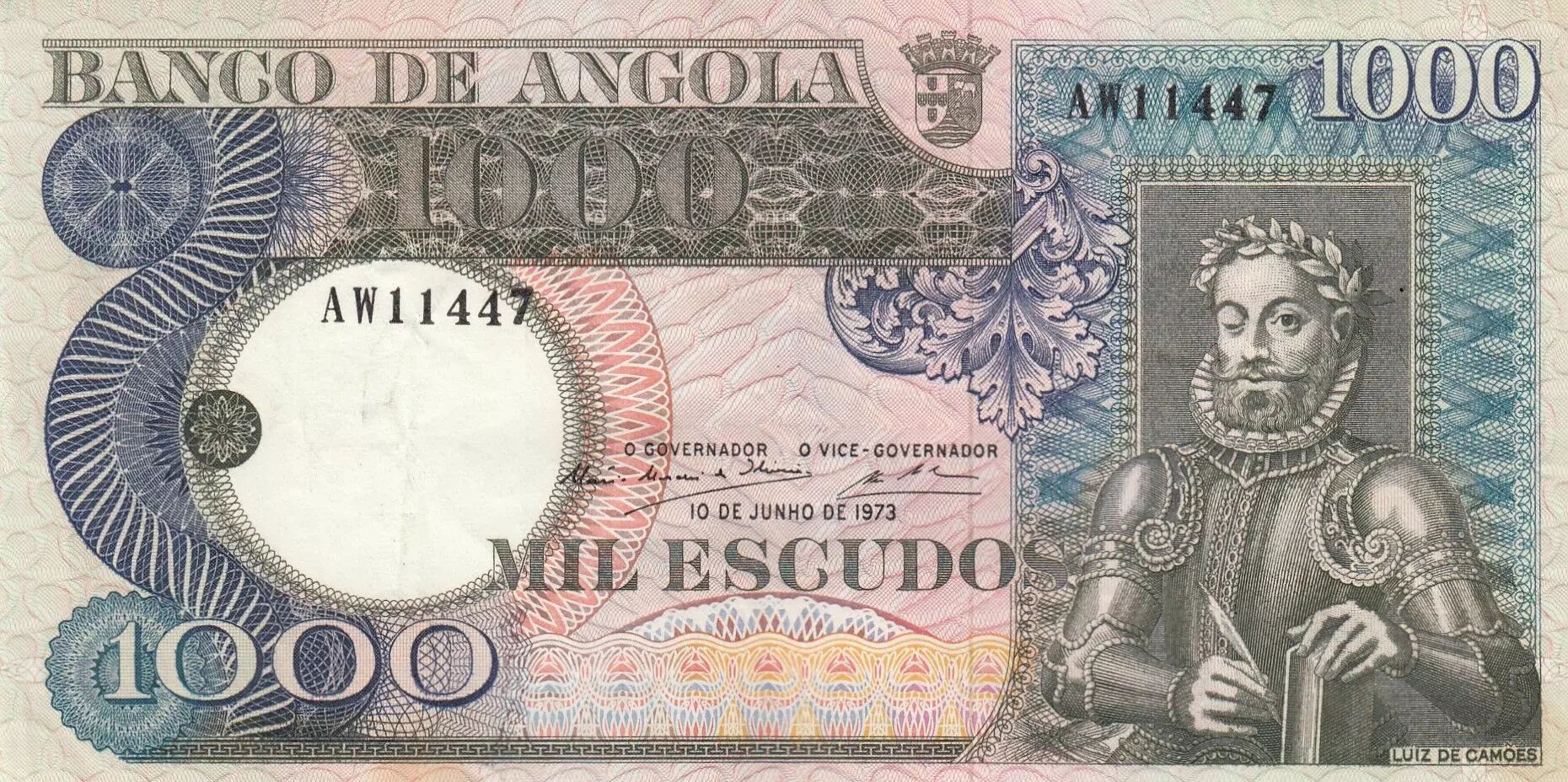 Billet Angola 1000 Escudos - L. de Camoes - Cascade - 10-06-1973 - Série AW